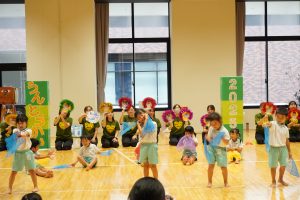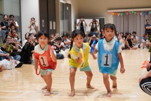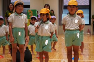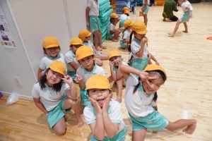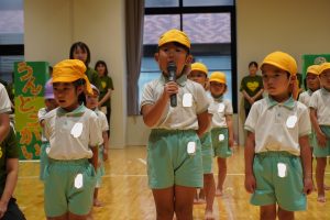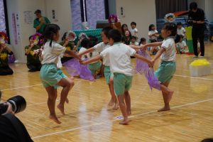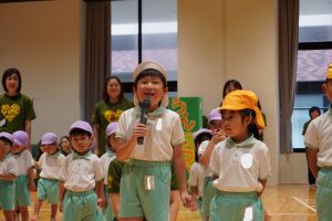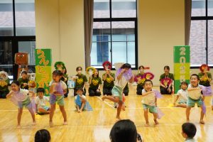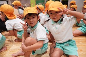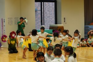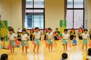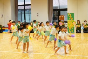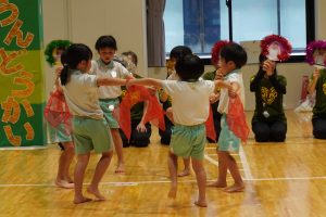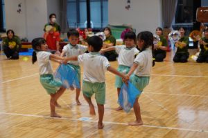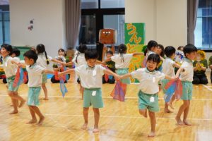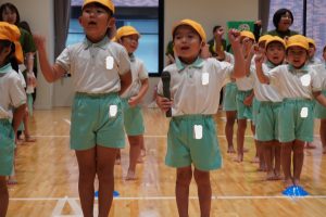 まずは、運動会の遊戯を披露しました。たくさんのカメラの前でニコニコの子どもたちでした