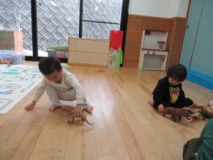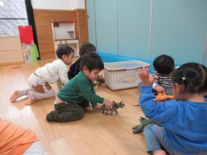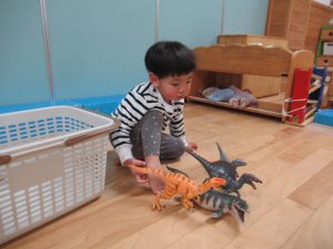 ドシン、ドシン。ゆっくりと恐竜を動かして恐竜ごっこ