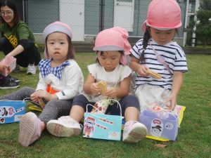 みんなでシートに座って食べるアンパンマンせんべい🍘