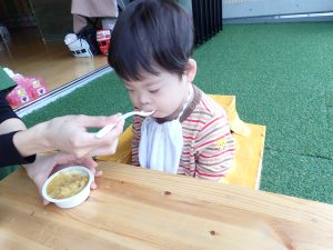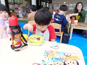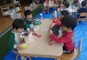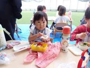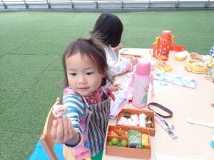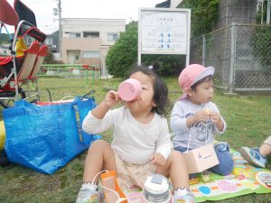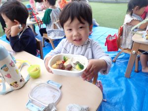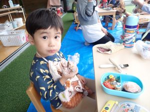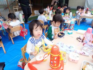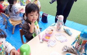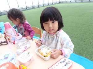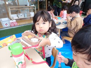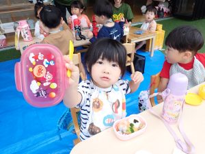 今日は、屋上園庭にブルーシートを敷いて食べますよ~🥦🍇🍎