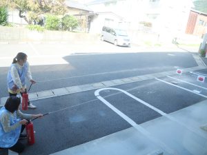 このように毎月交代で、訓練用の消火器を使って消火訓練を行っています![]()