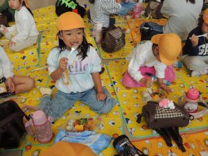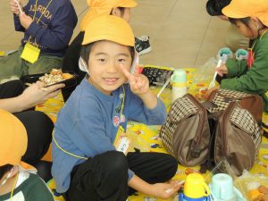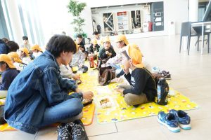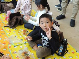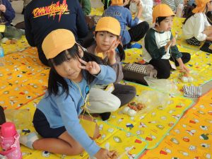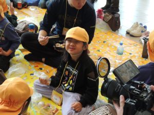 一人ひとりにシートをひいてもらい、グループの学生さんと一緒に食べました