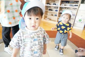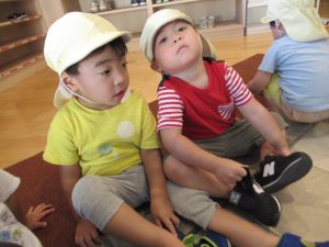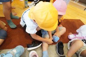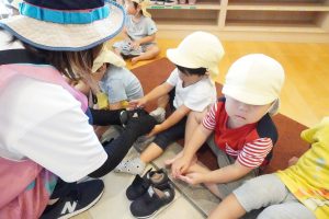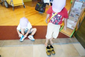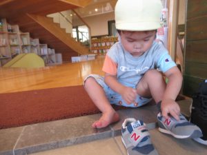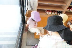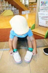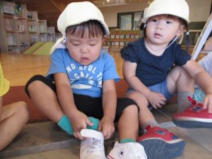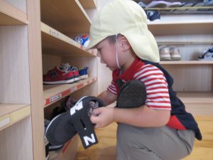 にじぐみさんは靴の左右を確認しながら一人で頑張ります!