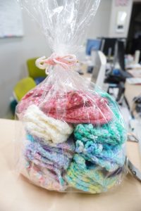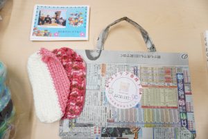 手作りのバッグと、編み物と、みんなが写っているカードをいただきました