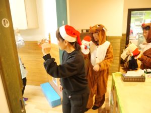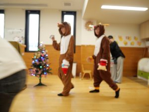 小学生、中学生のお兄さんお姉さん扮する、トナカイさんとサンタさんの登場です![]()