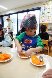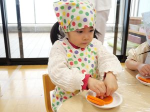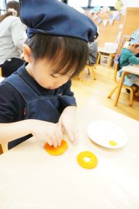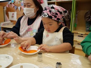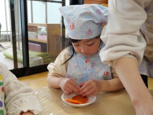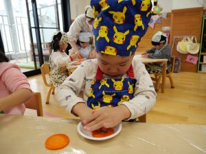 2月のクッキングでは、にじ組とこだま組は、カレーライスに入る人参の型抜きを行いました🥕