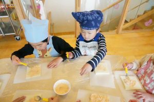 続いてそら組は、おやつのピザトーストを作りました🍕