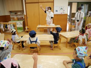 みんなが作ったピザを給食室のオーブンで焼き、おやつに食べました