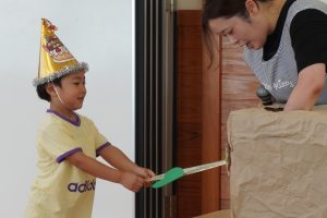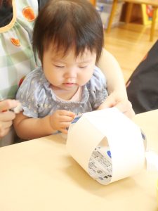 次は、牛乳パックにシールを貼って、牛乳パックボールをみんなで作りました。